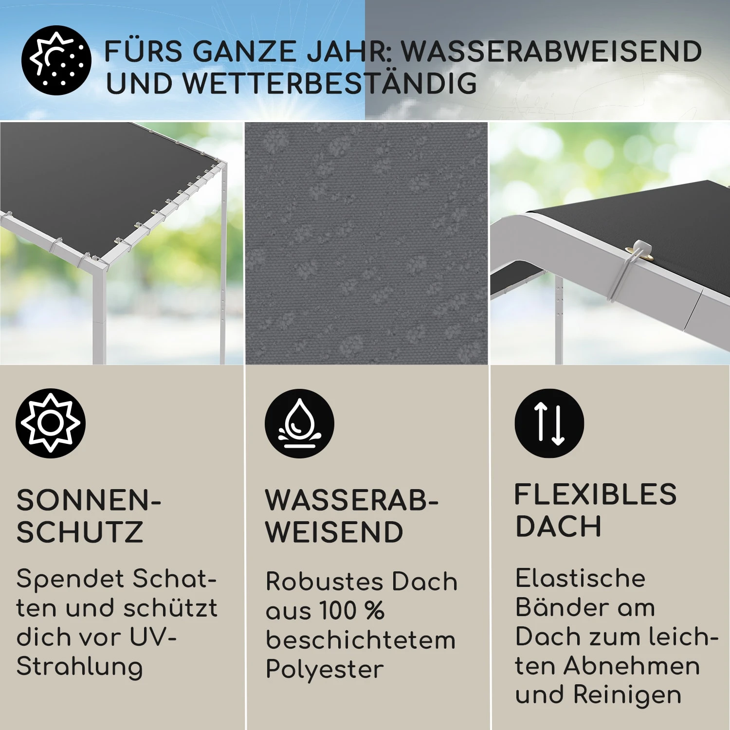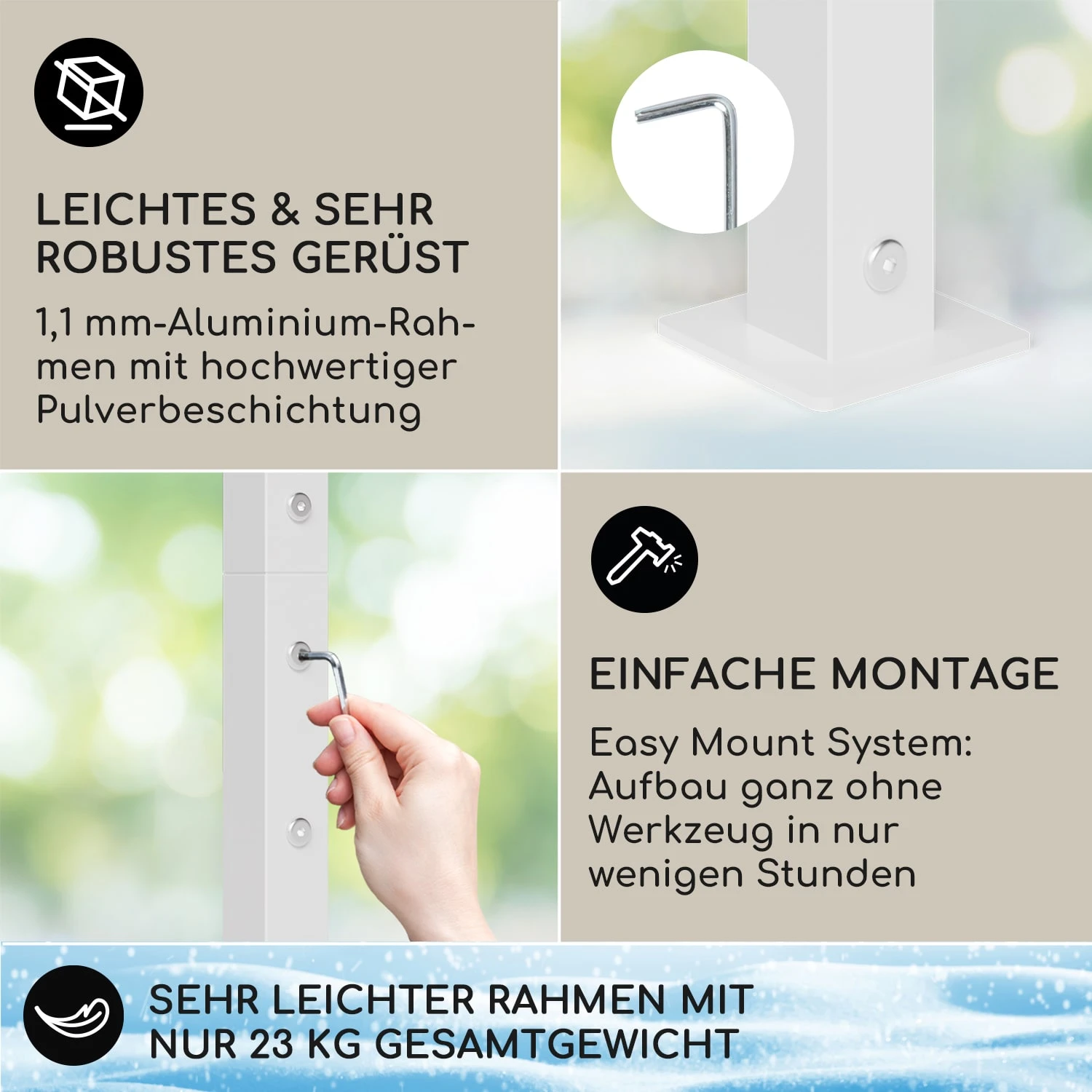 Mit der blumfeldt La Rochelle Gazebo fühlst du dich wie Gott in Frankreich. Das Sonnendach beschattet zuverlässig eine Fläche von 3 x 3 m und ist dank seines einfachen Stecksystems schnell in deinem Garten aufgebaut. Mit den mitgelieferten Gummibändern fixierst du unkompliziert das Dach des Pavillons. Das schlanke Design mit Schrägdach fügt sich dabei wunderbar in deinen Außenbereich ein. Sein Rahmen aus Aluminium sorgt für Stabilität und die wasserabweisende Dachbespannung schützt dank UV-Schutzklasse 50+ vor direkter Sonneneinstrahlung.