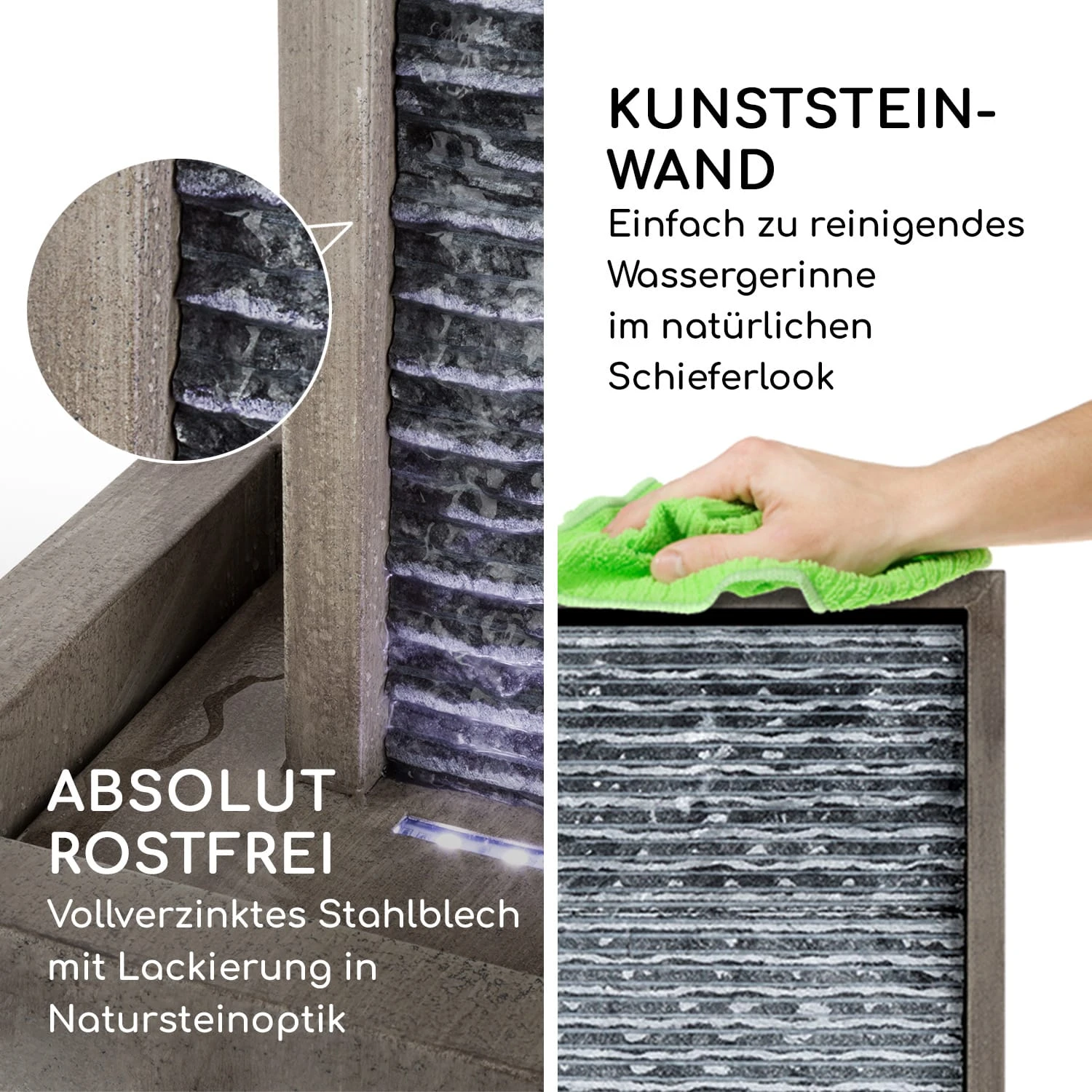 Mit dem sanften Plätschern des Blumfeldt Imperia Zierbrunnens wird das Relaxen gleich noch mal so schön. Sanft von einem LED-Streifen beleuchtet plätschert das Wasser in stetem Strom die 35 x 75 cm große Gerinnefläche hinab und sorgt so für meditative Entspannung. Zusätzlichen optischen Genuss liefert das Wasserspiel durch seine Rückwand im Look übereinandergeschichteter Schiefertafeln. So erfreut der Imperia Augen und Ohren gleichermaßen. Dabei ist er nicht nur äußerst robust und witterungsbeständig aus Metall gefertigt, sondern auch vollverzinkt: Ohne Rost und Anlaufen fügt er sich perfekt in vielerlei Ambiente ein. Damit sich das Wasserspiel niemals erschöpft, wird es von einer 10 W starken Pumpe in stetigem Umlauf gehalten. Sanft Rauschend entfaltet es eine äußerst meditative Wirkung und erfrischt seine Umgebung.
