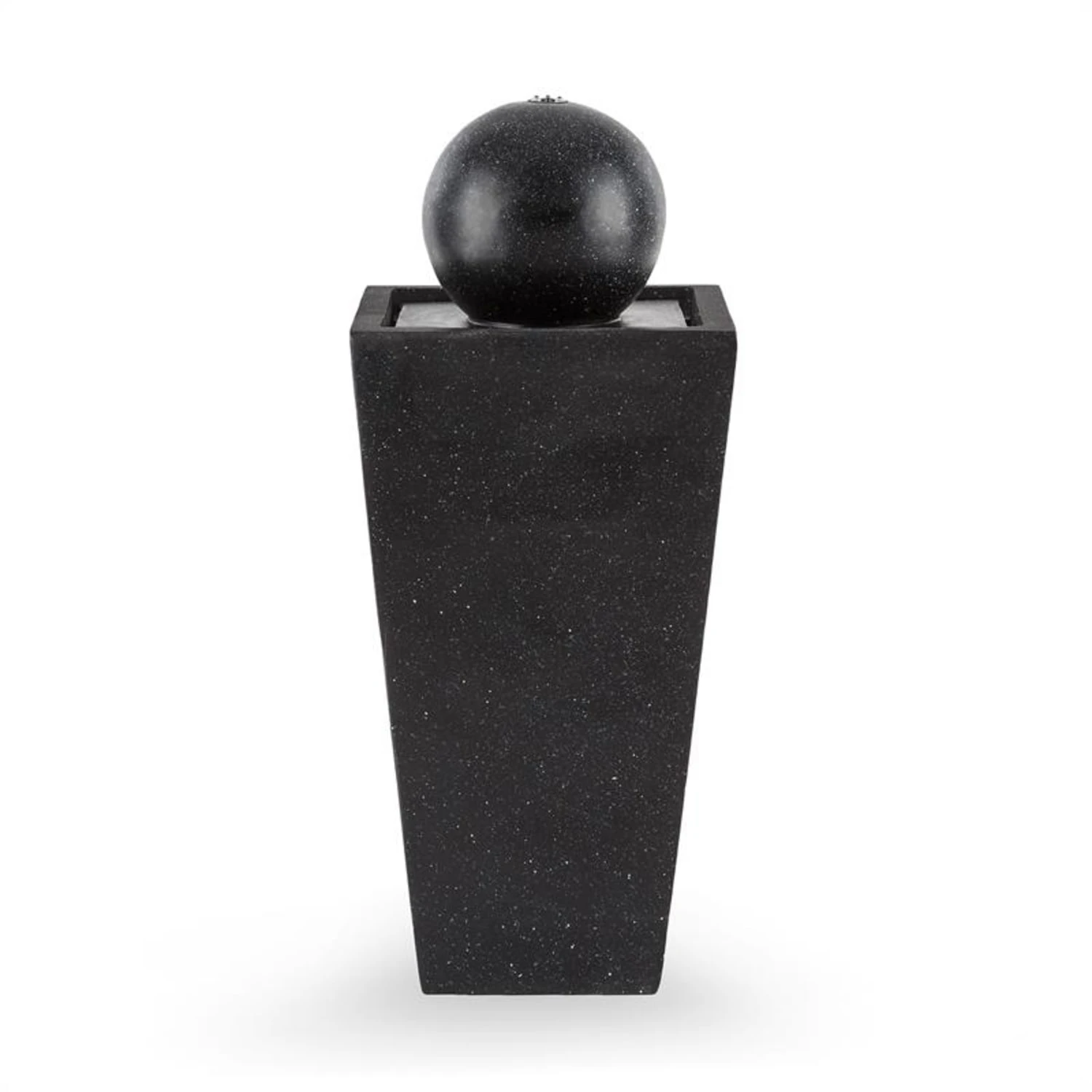 In stetem Strom sprudelt Wasser aus dem Haupt des Blumfeldt Königsbrunn Gartenbrunnens und rinnt an der Außenhaut der Kugel hinab, um aus dem versteckten Bassin seine Reise von Neuem zu beginnen. So entsteht ein optisch ansprechendes Wasserspiel, dass zu meditativer Entspannung einlädt und eine erfrischende Kulisse für Grünpflanzen oder Sitzecken bietet. Komplett aus Polyresin gefertigt verleiht ihm die Gestaltung in Form polierter Basaltblöcke einen edlen, unverwüstlichen Charme. Den unterstreicht in dunklen Stunden stimmungsvoll eine Krone aus strahlenden LED-Lichtern, die der Umgebung eine königliche Atmosphäre verleiht.