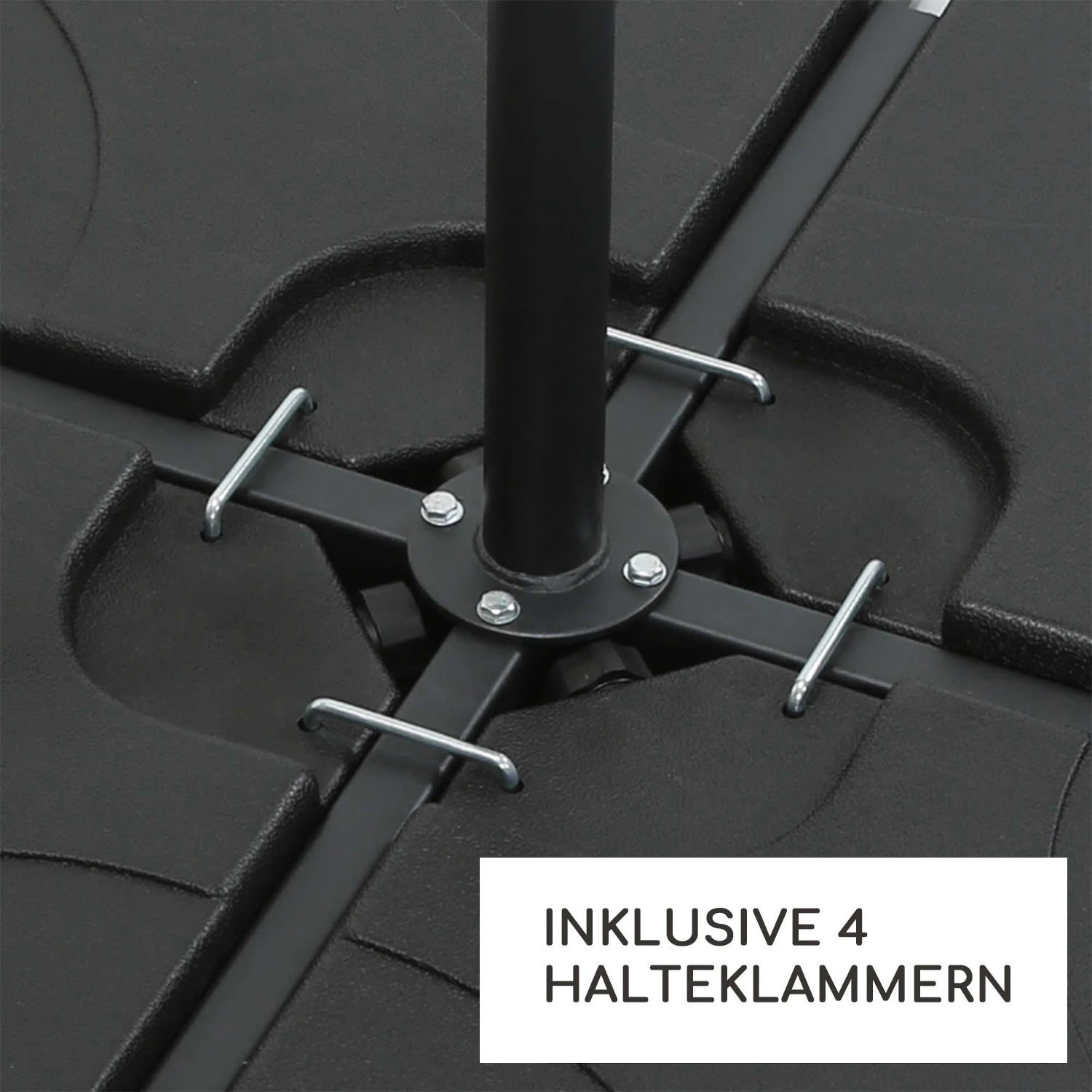 Neben ihrer zuverlässigen Funktion als Beschwerungselemente überzeugen die Sonnenschirmständer-Gewichte auch in Optik und Komfort. Sie passen sich geschickt an das Bodenkreuz deines Schirmständers an und ergeben so einen modernen Sockel. Ein seitlicher Tragegriff macht die Leergewichte zu einem sehr praktischen Sommer-Accessoire.