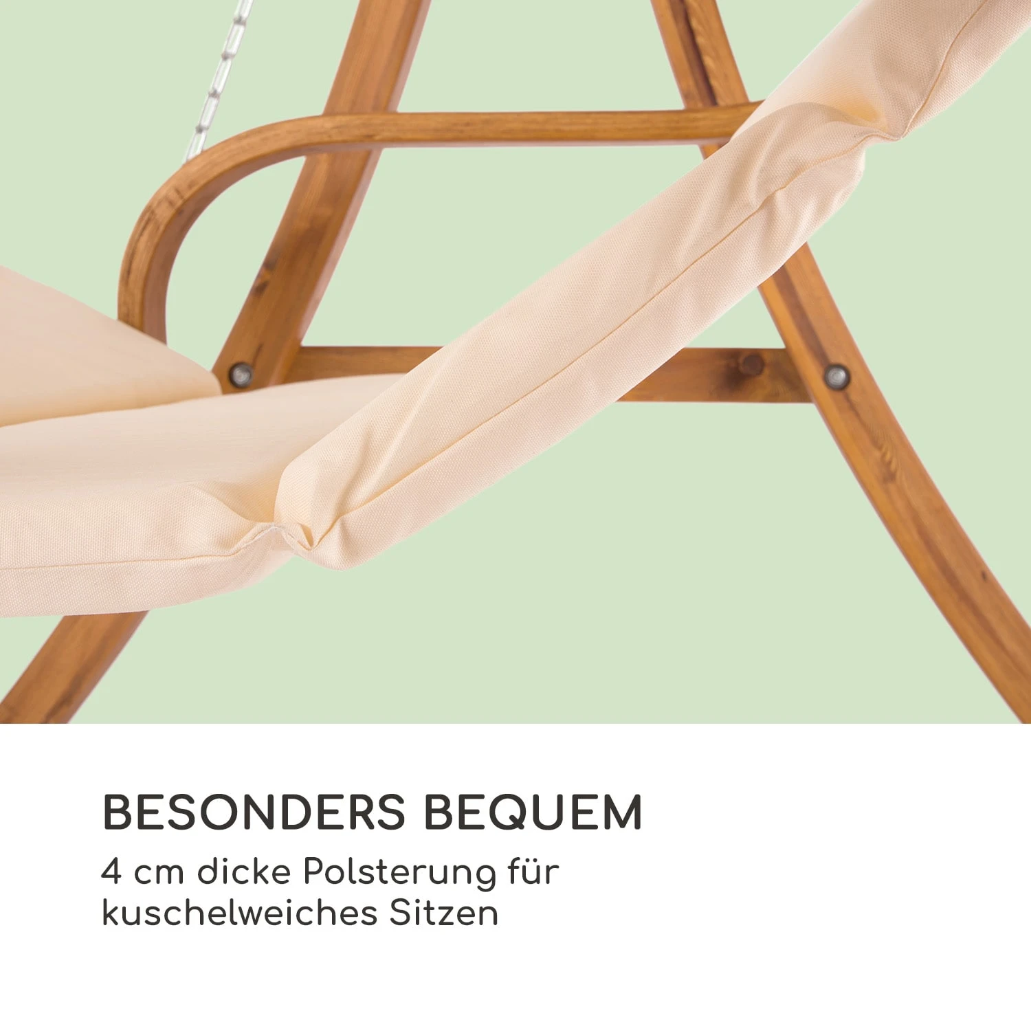„Stilvoller Komfort und hohe Belastbarkeit: 110 cm breite Sitzfläche mit 4 cm dicken Sitzpolstern und Sonnensegel. Maximale Belastung von 250 kg durch Lärchenholzbalken und rostfreie, vollverzinkte Stahlketten.“