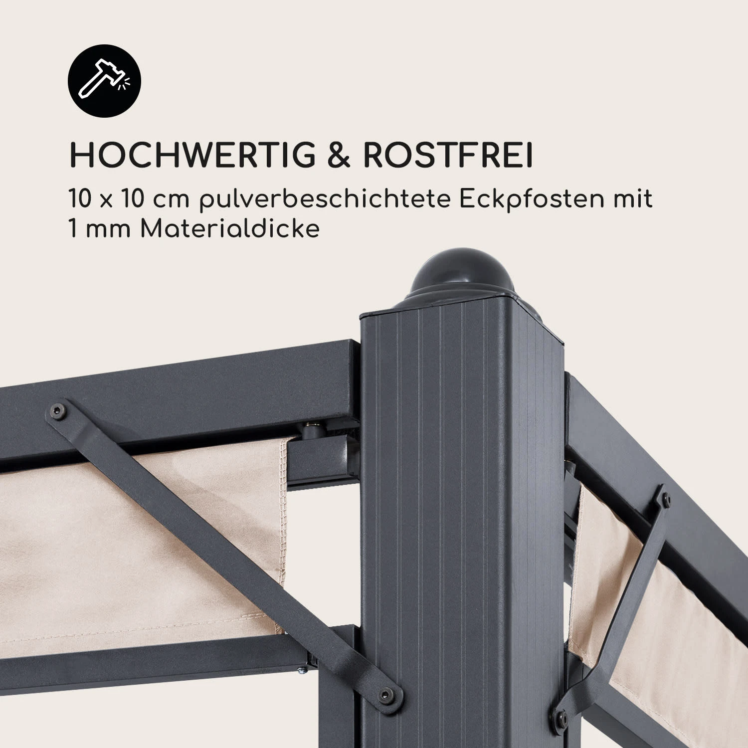 Das Pavillon-Komplettset enthält alles, um ein Areal von 3 x 4 Metern mit wenig Aufwand in einen sommerlichen Schattenplatz zu verwandeln. Das Gerüst aus 10 x 10 cm Pfosten mit 1 mm Materialstärke ist nicht nur äußerst stabil: Dank der Fertigung aus pulverbeschichtetem Aluminium ist es auch sehr leicht. Perfekt für die langfristige Erholung im Freien – ohne Rostbildung.