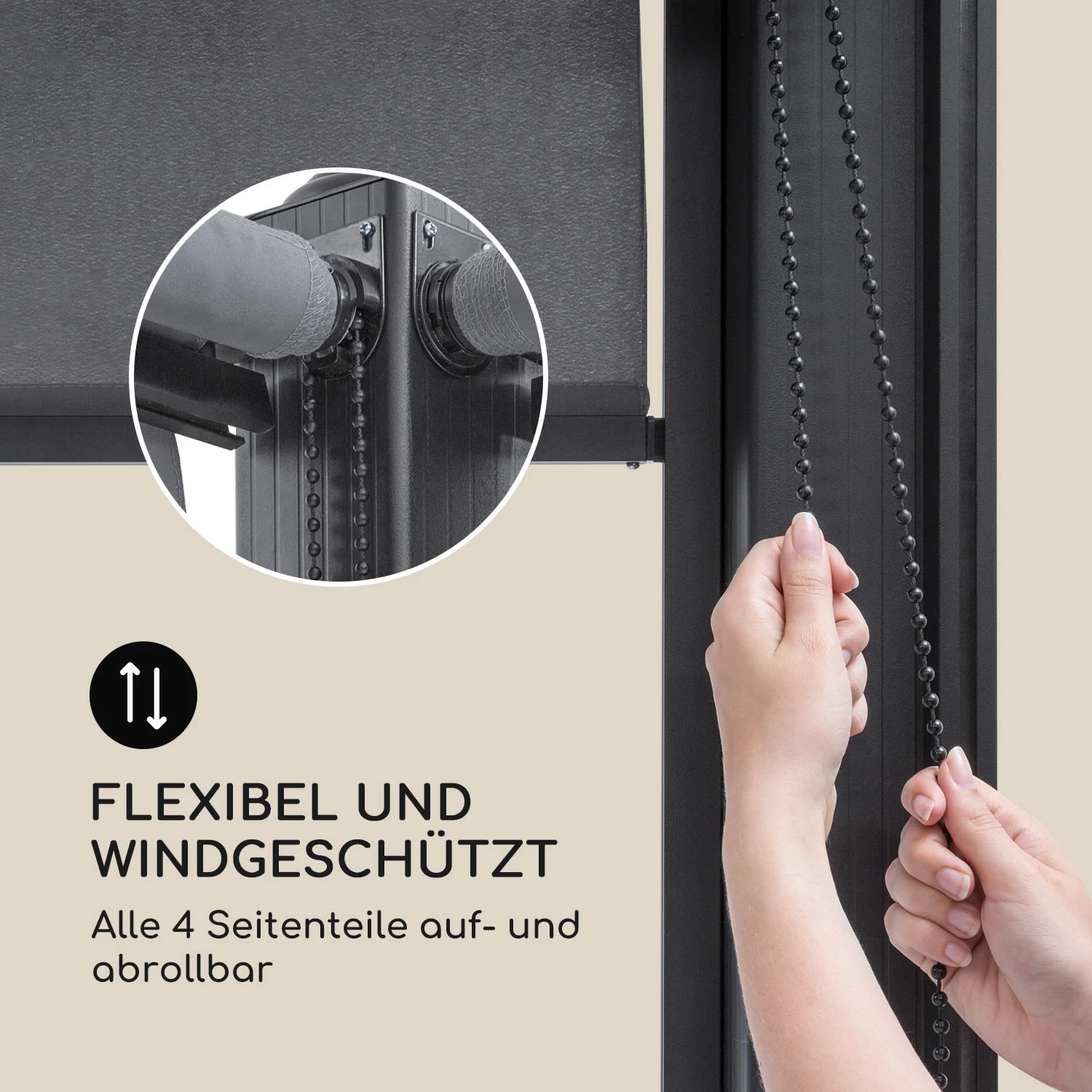 Mit dem stufenlos raffbaren Stoffdach aus 180 g/m² Polyester erhält man die volle Kontrolle über Schatten und Sonne. Der Seilzug lässt das Sonnendach des Pavillons in seinen Führungsschienen geschmeidig vor- und zurückgleiten, die wasserabweisende Beschichtung schützt vor Schimmel und kurzen Regenschauern. Durch die flexibel auf- und abrollbaren Seitenteile aus 160 g/m² Polyester-Stoff bleibt man die ganze Zeit windgeschützt.