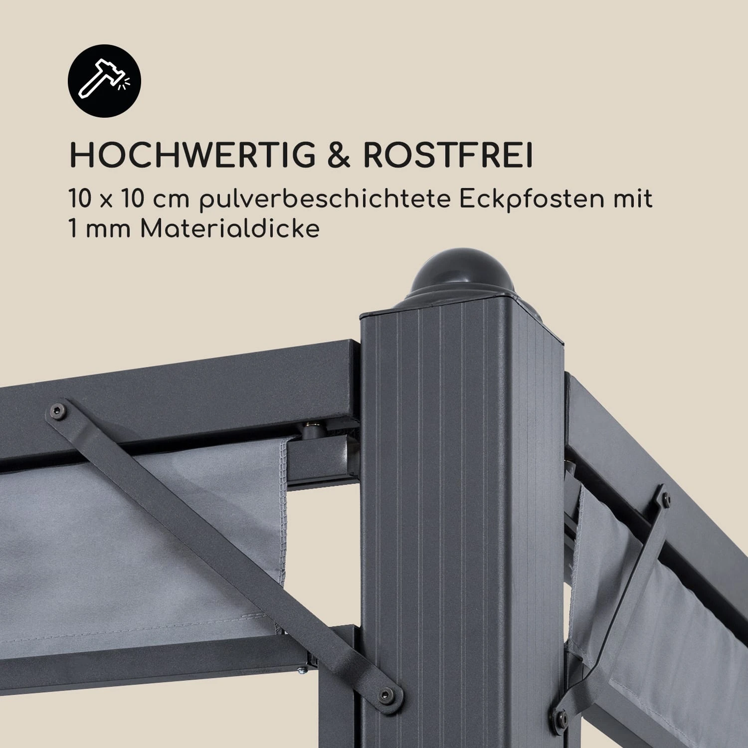 Das Pavillon-Komplettset enthält alles, um ein Areal von 3 x 4 Metern mit wenig Aufwand in einen sommerlichen Schattenplatz zu verwandeln. Das Gerüst aus 10 x 10 cm Pfosten mit 1 mm Materialstärke ist nicht nur äußerst stabil: Dank der Fertigung aus pulverbeschichtetem Aluminium ist es auch sehr leicht. Perfekt für die langfristige Erholung im Freien – ohne Rostbildung.
