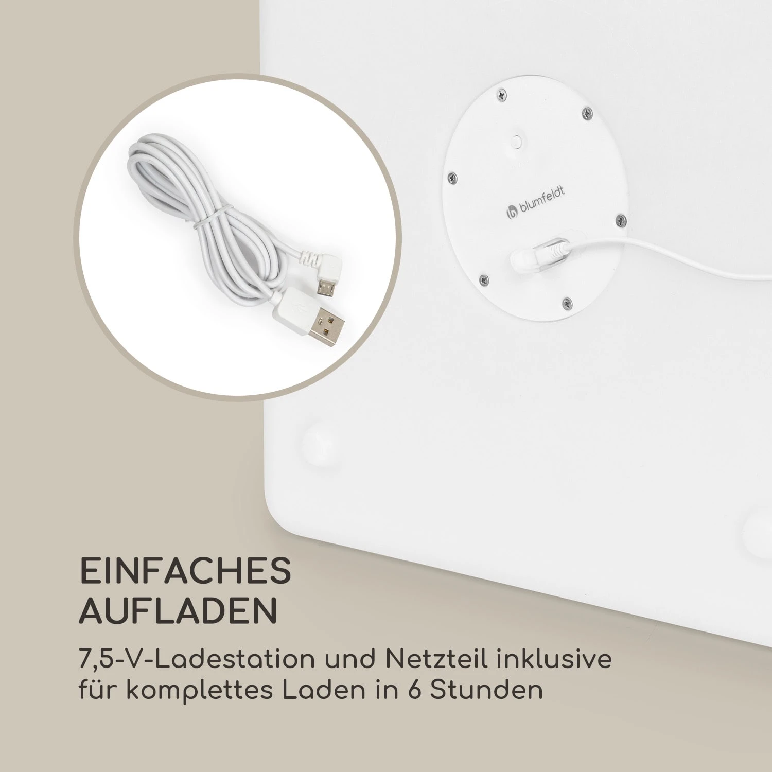 Seinen Strom erhält der Shinecube XL Lichtwürfel aus einem integrierten 2400mAh Li-Ionen-Akku, der per mitgeliefertem USB-Ladekabel unkompliziert aufgeladen werden kann. Eine vollständige Ladung lässt den Shinecube XL – je nach Betriebsmodus – für 5 bis 15 Stunden leuchten. Zur einfachen Bedienung, vor allem, wenn er als Dekorationslicht in schwer zugänglichen Bereichen verwendet wird, besitzt der Shinecube XL von Blumfeldt eine leicht verständliche Fernbedienung mit einer Reichweite von 3 Metern.