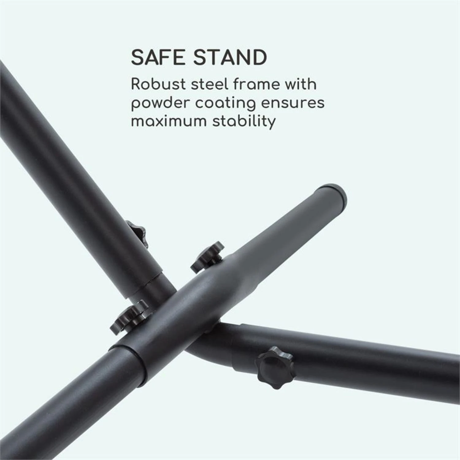 Die freistehende Blumfeldt Sri Lanka Swing Hängematte besteht aus einem robusten Stahlrahmen mit Pulverbeschichtung, der dank seiner tragfähigen Konstruktion jederzeit einen äußerst sicheren Stand gewährleistet. Inmitten der stählernen Streben mit kreisrunden Enden, die zu beiden Seiten die Eckpunkte des stabiles Gerüsts bilden, ist eine Stoffhängematte gespannt, die zu 65% aus Baumwolle und zu 35 % aus Polyester besteht. Dank ihrer großzügigen Fläche von 200 x 150 cm bietet die Blumfeldt Sri Lanka Swing Hängematte ausreichend Platz für entspanntes Liegevergnügen bis zu einem Maximalgewicht von 160 kg. Die Hängematte passt sich zudem durch ihre Stylish Comfort-Bauweise der natürlichen Form des Körpers an und bietet somit maximalen Liegekomfort. Aus robustem und leicht zu reinigendem Material gefertigt, kann sie während der gesamten Sommerperiode eingesetzt werden.
